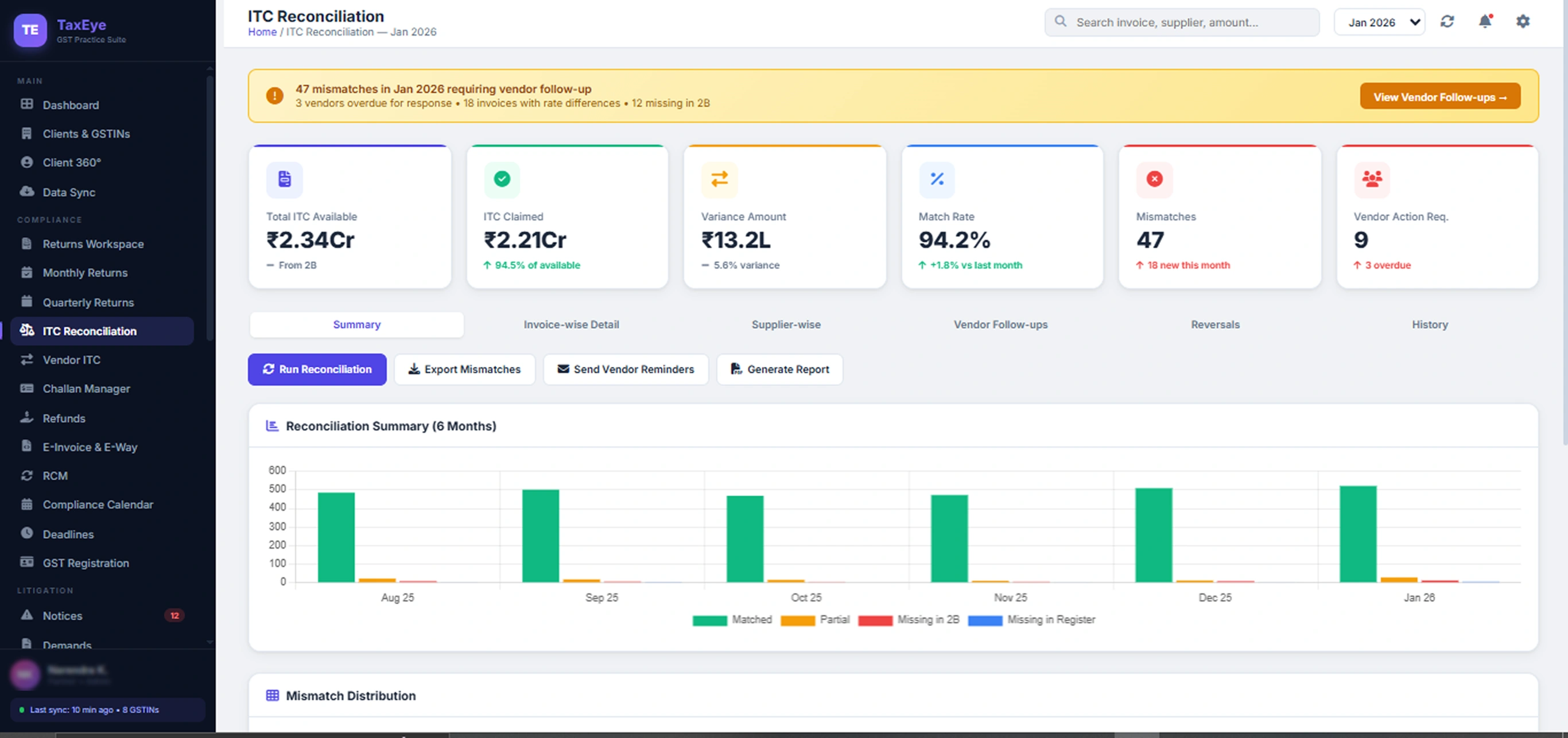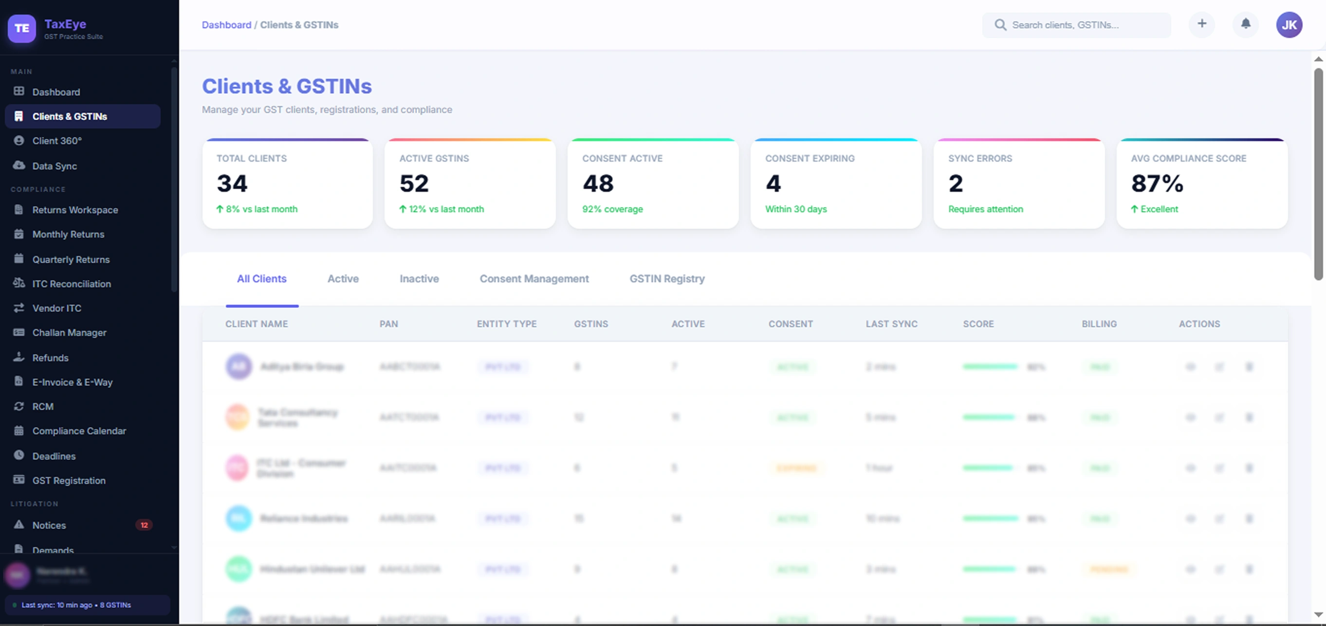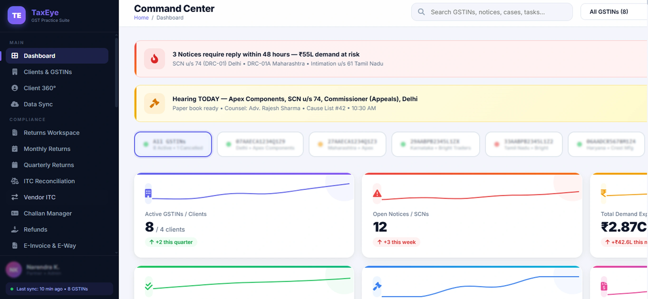 Central dashboard for GST notices, deadlines, replies, and outcomes across all clients.