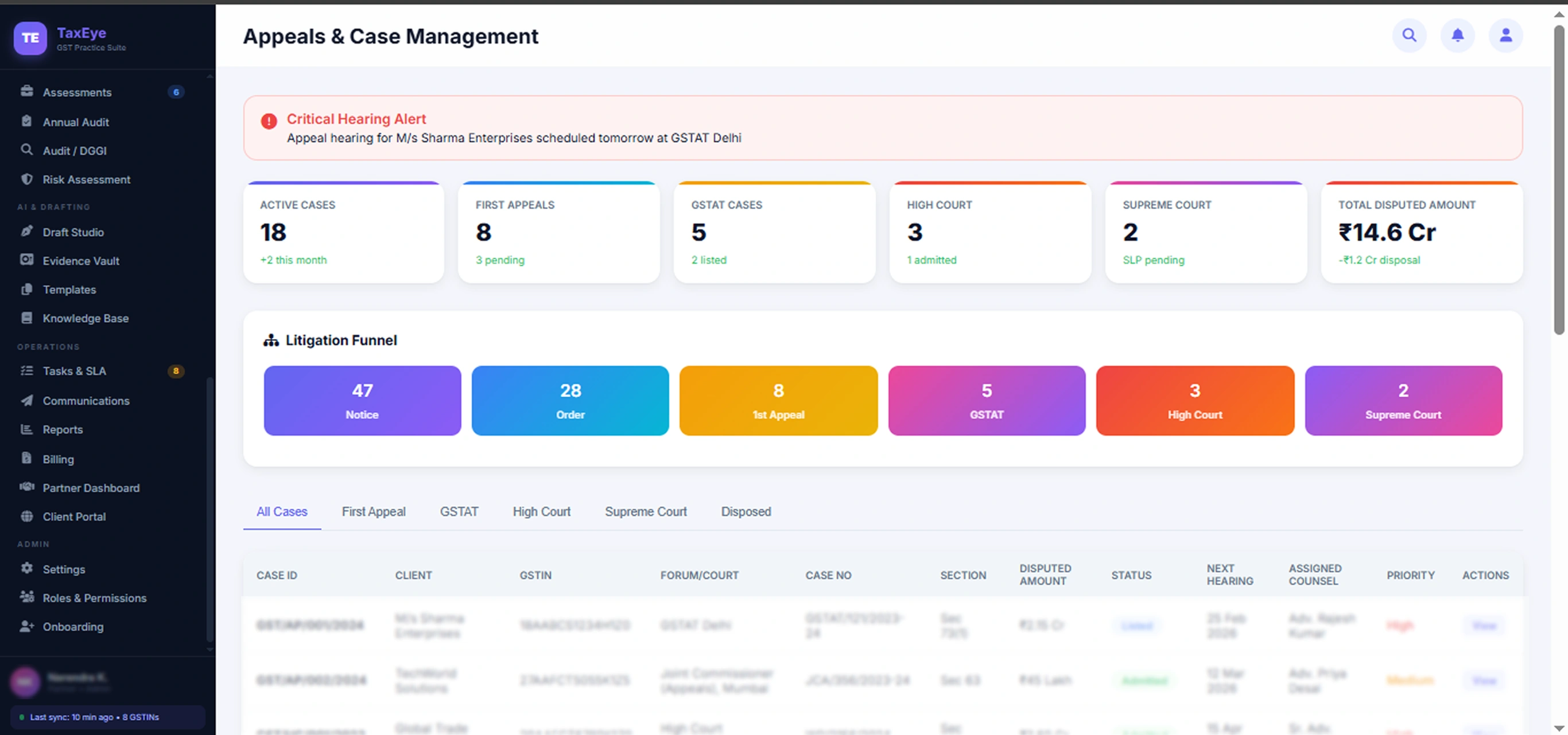 All dates in one view — hearings, filings, internal tasks
