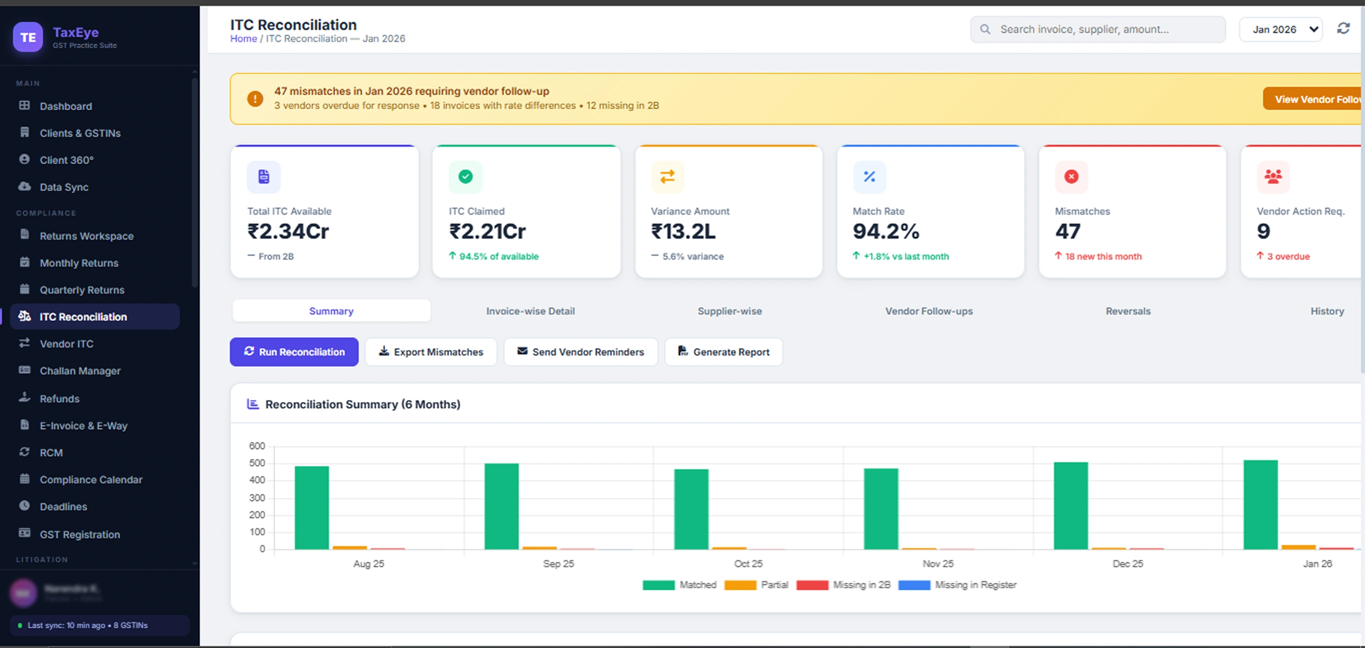 Client-wise invoices, retainer status, aging report